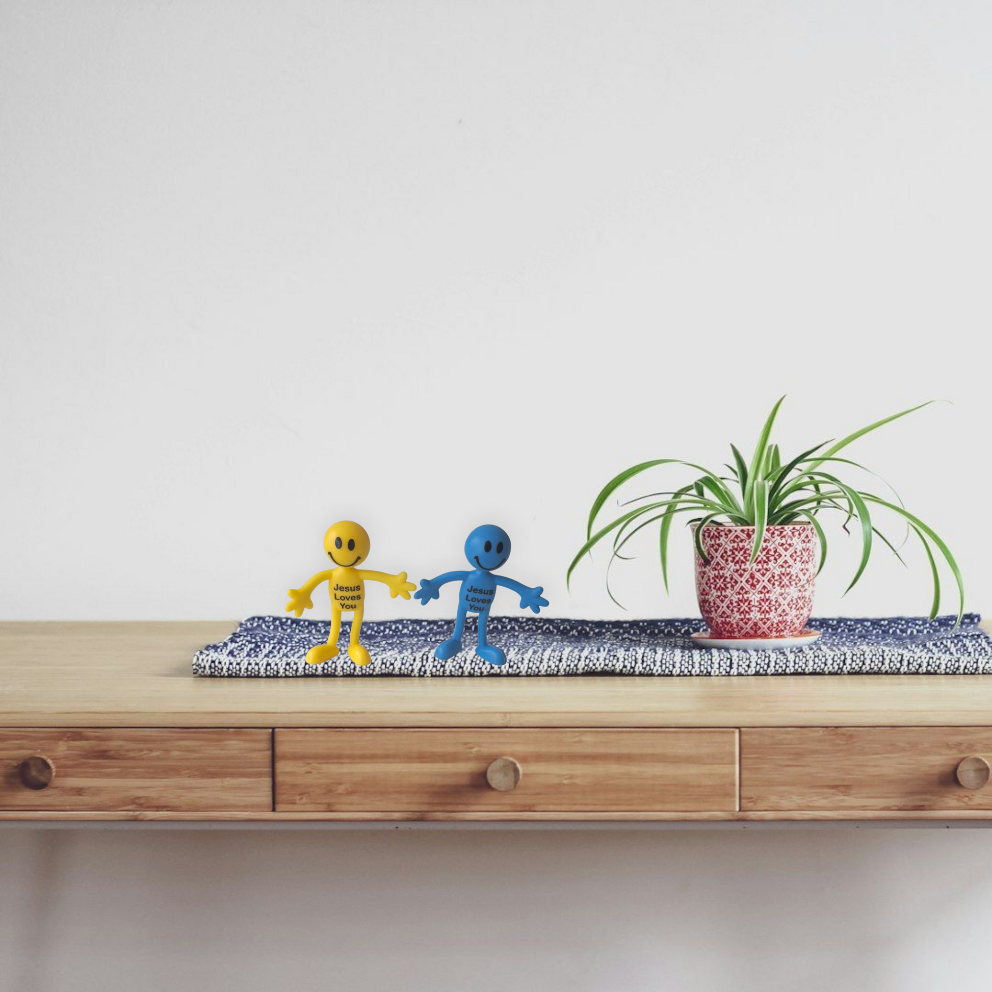 Flexible Rubber Buddies with "Jesus Loves You" wordings printed on comes in a pair. Fun and bendable. Flexible Rubber Buddies are 4" tall.